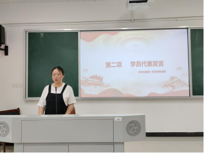 结业典礼在雄壮的国歌声中拉开帷幕。首先,来自本科生英语第一党支部的焦佳艳作为本期优秀学员代表分享了自己的学习心得。她承诺,虽然此次培训班已经告一段落,但她将继续学习有关党的理论知识,强党性、重实践、建新功。同时,她也会牢记习近平总书记“注重学习提升,矢志艰苦奋斗,从一点一滴做起,把小事当大事干”的敦敦教诲,用实际行动诠释共产党员的先锋模范作用,为党旗添光彩,为党徽增荣光。