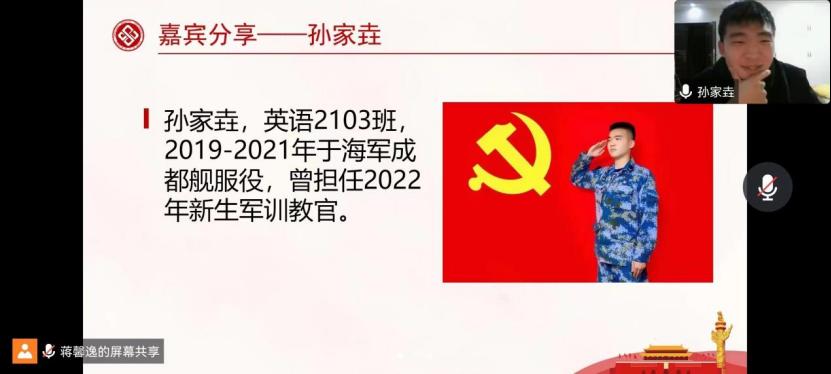 随后,20年入伍、22年退伍的英语2103班张宇腾同学和19年入伍、21年退伍的英语2103班孙家垚同学先后分享了自己选择参军入伍的心路历程和军旅收获,并鼓励同学们积极踊跃报名参军体检,“勇于迈出第一步”是两位退伍士兵对同学们的共同劝勉。