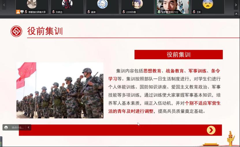 蒋老师对目前参军入伍的国家政策、学校政策以及福利待遇、升学就业等方面进行了介绍,并介绍了往年学院以及学校参军报名的具体人数情况。